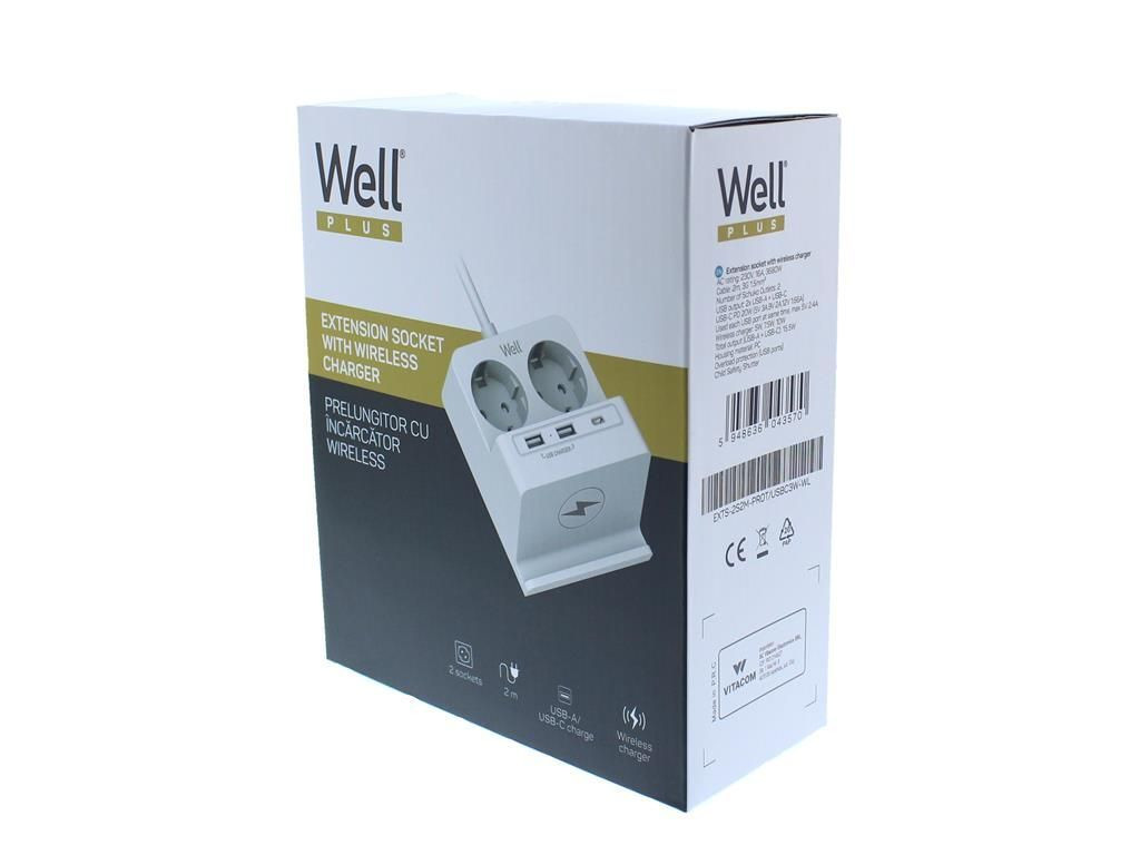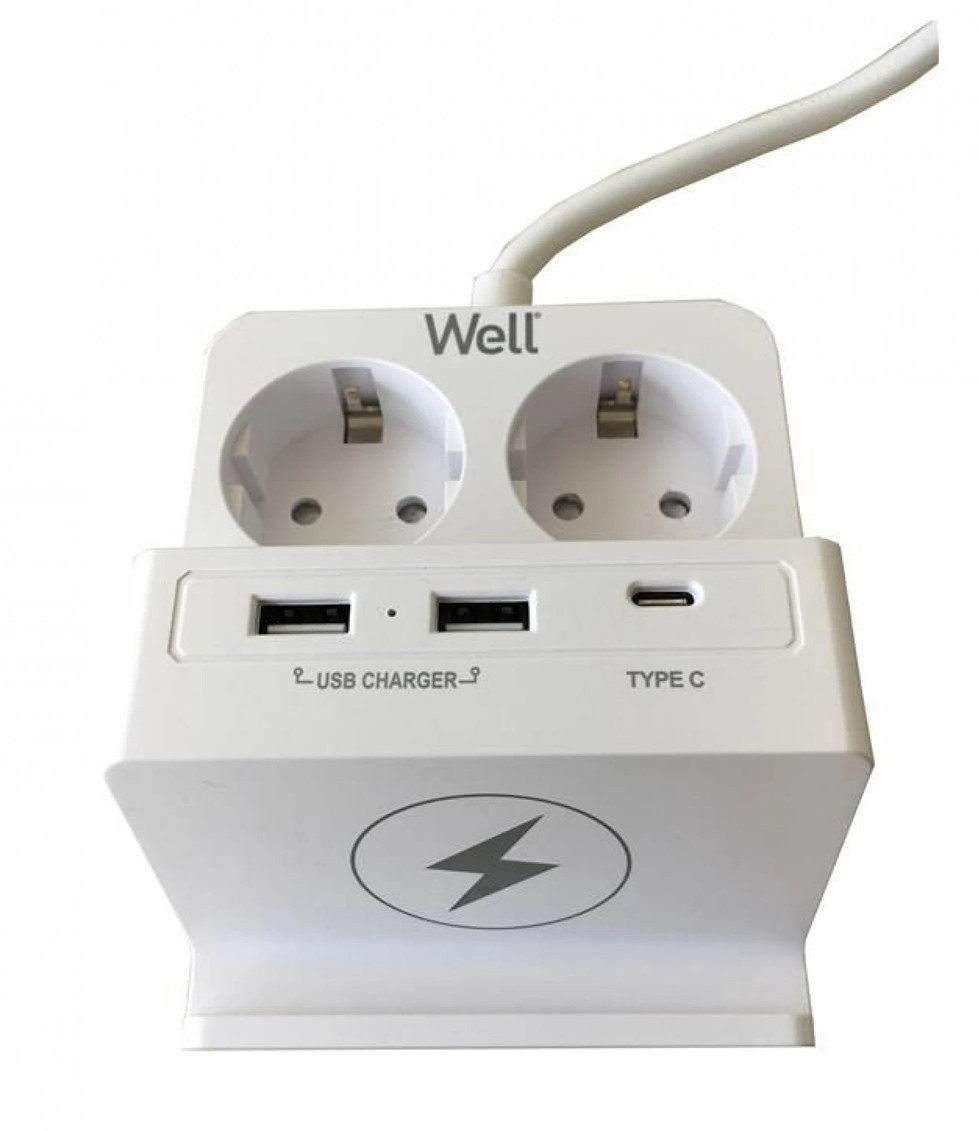 A gyerekzárral ellátott elosztó a fali aljzathoz csatlakoztatva két tápcsatlakozó aljzatot biztosít, ezen felül rendelkezik 2 USB-A és egy USB-C töltőporttal, valamint Wireless töltőfunkcióval is.