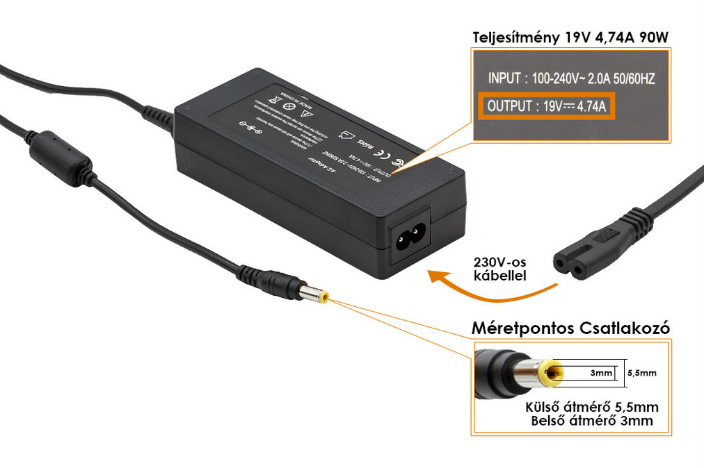 - Csatlakozó: 5,5 x 3 mm + center pin