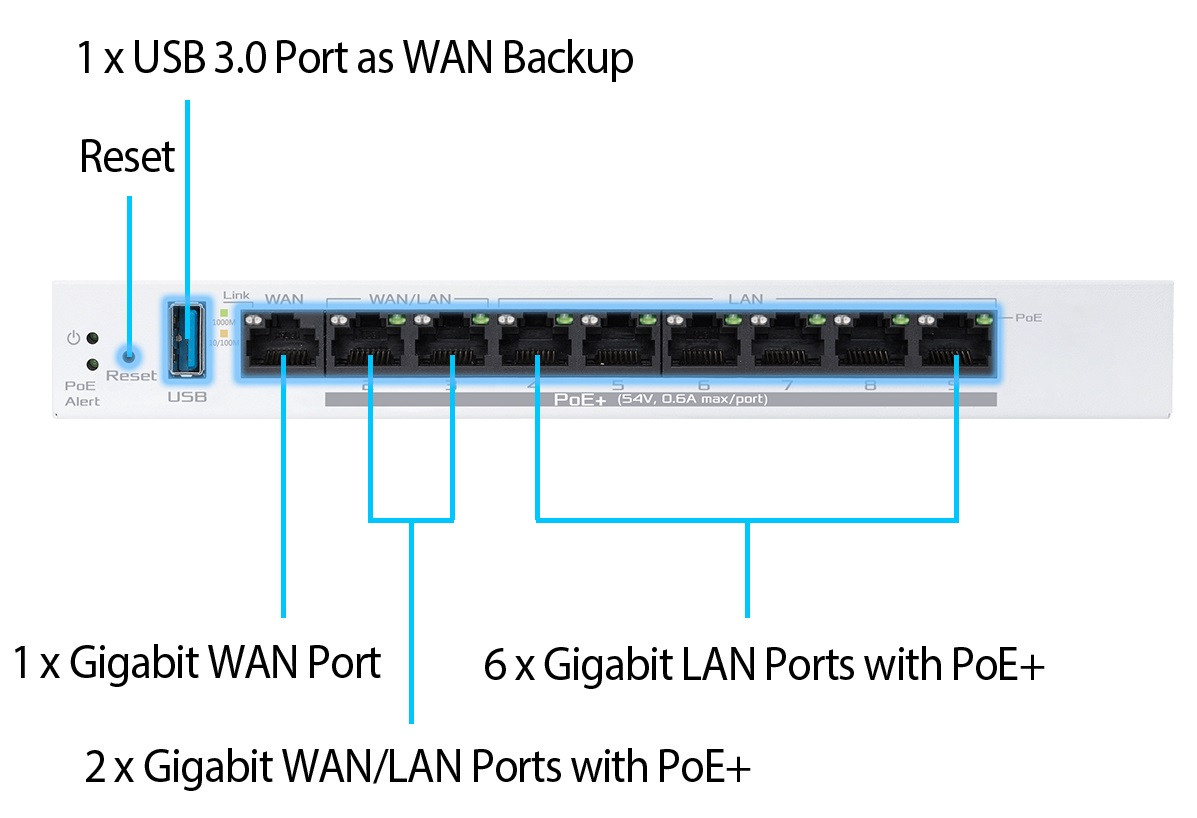 - Gigabit LAN Port x 8 (Changable WAN/LAN Port x 2)