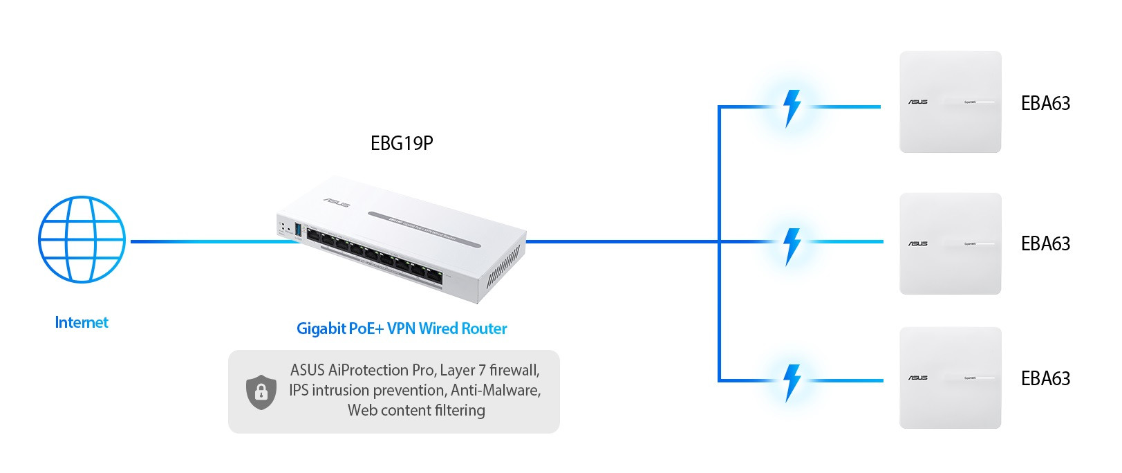 - Egyszerűen kezelhető eszköz – Kényelmesen központi vezérlés a PoE-eszközök, például az EBA63 felett, webböngészőn vagy az ASUS ExpertWiFi mobilalkalmazáson keresztül csatlakoztatva az EBG19P-hez.