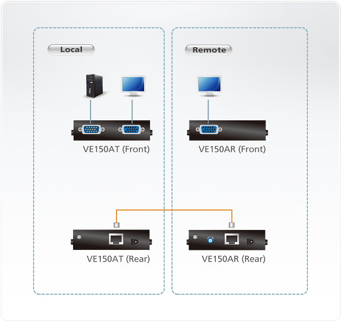 VE150 video extender egy KVM továbbító megoldás, mely Cat5e kábelt használ a jeltovábbításhoz. A jeltovábbítás egészen 150 méterig elmehet. Ideális gyáraknak, és építkezésekhez, vagy bármilyen olyan területre, ahol problémás lehet a távoli elérés, de a kábelezés már adott. A felbontás függ a távolság nagyságától, így lehetséges, hogy nagyobb távolság esetén a felbontás mérete csökkenhet.