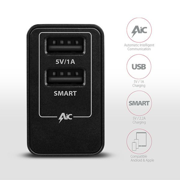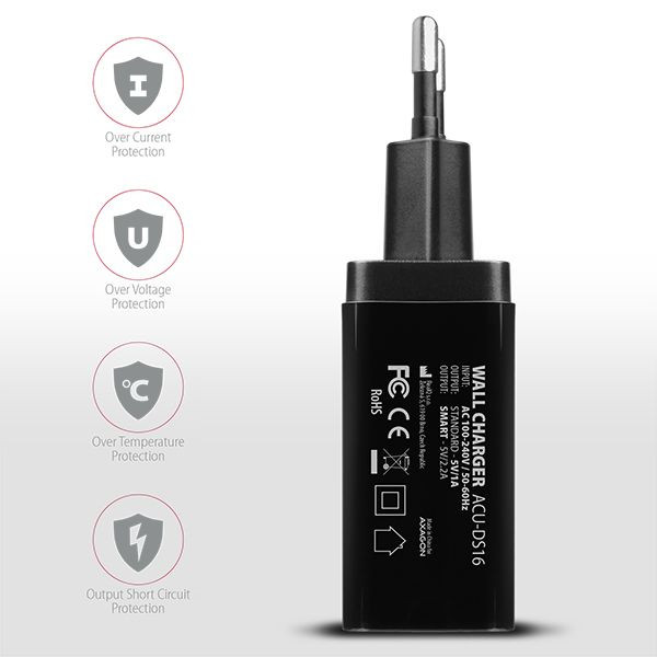 Axagon 220V-os Dual USB fali töltő (1x 2,2A Smart port + 1x 1A USB port)