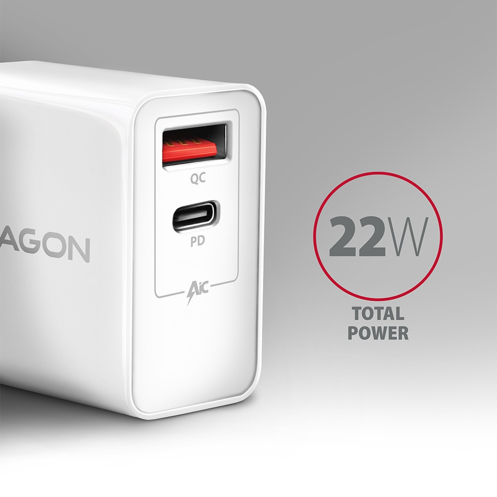 220V-os fali USB töltő Quick Charge (QC3.0) funkcióval, 1db QC3.0 Type-A, és 1db PD 2.0 Type-C USB aljzattal.