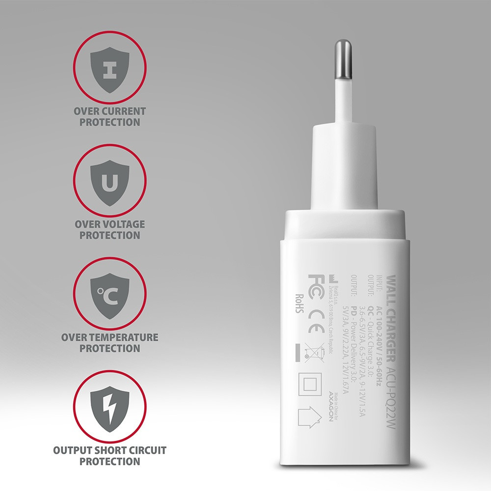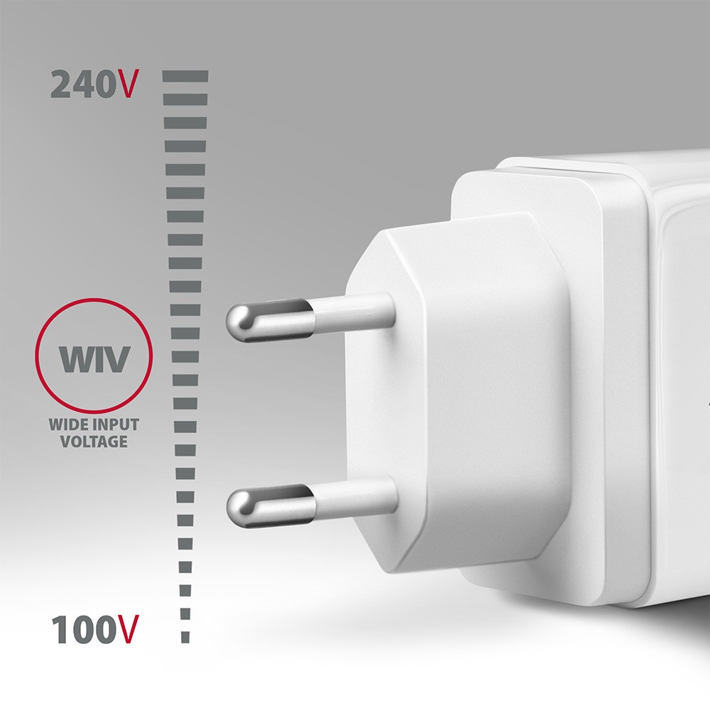 - széles bemeneti feszültség tartomány, megóvja az adaptert a bemeneti feszültséghiánnyal és túlfeszültséggel szemben, valamint lehetővé teszi több „nemzeti töltési standard” használatát.