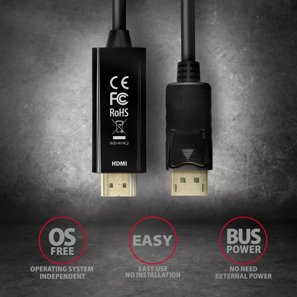 Az AXAGON RVD-HI14C2 DisplayPort -> HDMI aktív kábel – adapter összeköti a HDMI monitor/TV/projektort a számítógéppel a DisplayPort kimenet segítségével.