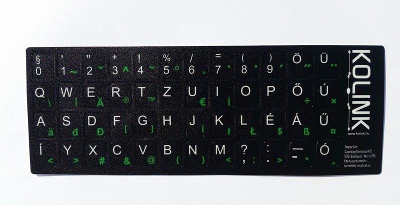 A magyar ABC teljes karakterkészlete (ékezetes karakterekkel) kiegészítve az általánosan használt írásjelekkel. A teljes billentyűgombot lefedi.