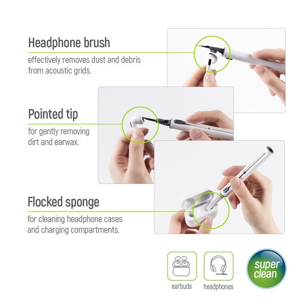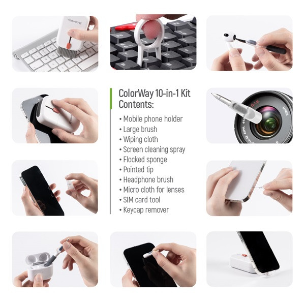 Univerzális, 10 az 1-ben tisztítókészlet, amelyet kifejezetten elektronikai eszközök – például fejhallgatók, billentyűzetek, kijelzők és kamerák – kíméletes és hatékony tisztítására terveztek. Kompakt kialakításának köszönhetően könnyen hordozható, így otthoni és irodai használatra egyaránt ideális választás.