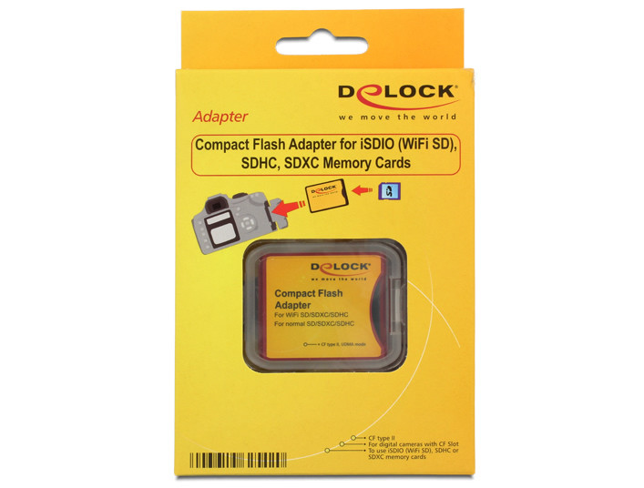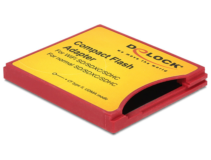 Ez a Delock által gyártott Compact Flash (CF) adapter lehetővé teszi, hogy sima SD memóriakártyát vagy WiFI SD-memóriakártyát használjon Compact Flash nyílással rendelkező digitális fényképezőgépekben. Egyszerűen helyezze az SD kártyát az adapterbe, majd azt a fényképezőgépbe. Az adatátviteli sebesség a felhasznált memóriakártyától függ.