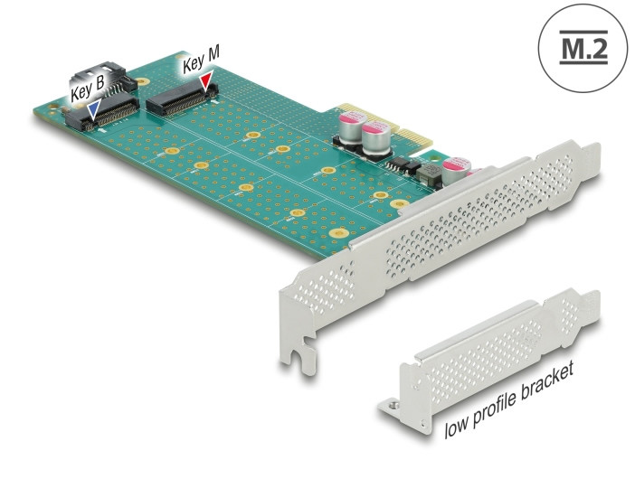 Ez a Delock PCI Express-kártya két M.2 aljzattal bővíti ki a számítógépét. Egy 22110, 2280, 2260, 2242, 2230 formátumú M.2 SATA-modullal csatlakoztatható a kártyán, és SATA-kábellel csatlakoztatható az alaplaphoz. Ezenkívül egy 22110, 2280, 2260, 2242, 2230 formátumú M.2 PCIe modullal is csatlakoztatható. A két aljzat egyszerre is használható.