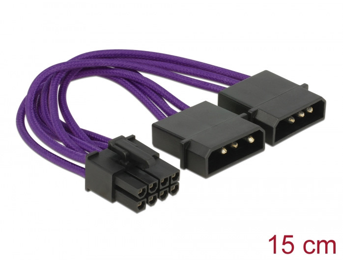 Ez a Delock adapterkábel két MOLEX csatlakozót alakít át egy 8 tűs PCI-E tápcsatlakozóvá. Kifejezetten olyan ATX tápegységekhez készült, amelyek nem rendelkeznek PCI-E csatlakozóval. Segítségével külön tápellátást igénylő VGA-k tápellátása biztosítható a 6-pin-es csatlakozón keresztül.