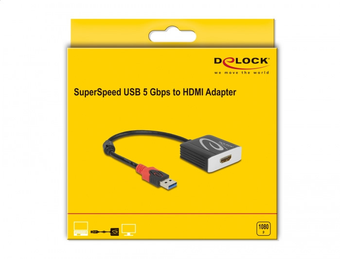 Ezzel a Delock adapterrel további HDMI-monitort, kivetítőt stb. csatlakoztathat asztali vagy hordozható számítógéphez egy USB A-típusú csatlakozón keresztül.