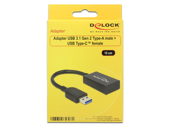 Ez a Delock átalakító lehetővé teszi, hogy egy USB Type-C™ típusú csatlakozódugóval ellátott eszközt csatlakoztasson egy USB A-típusú csatlakozóhüvelybe.