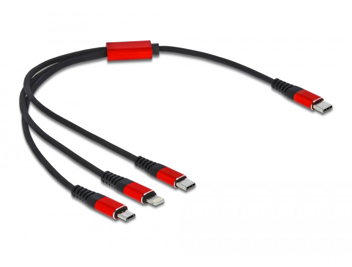 Ez a Delock 3 az 1-ben töltő kábel használható különböző eszközök töltésére, például Lightning™-, Micro-USB- vagy USB Type-C™ csatlakozási felülettel rendelkező tabletek vagy okostelefonok tápellátására egy USB áramforráson keresztül.
