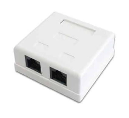 2db UTP betét fogadására alkalmas falra szerelhető műanyag csatlakozó doboz, valamint 2db betét beleszerelve.