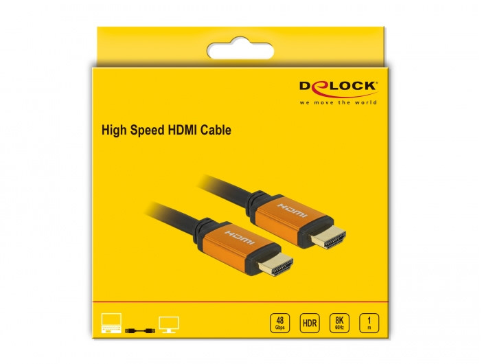 Ez a kiváló minőségű Delock nagysebességű HDMI-kábel a HDMI interfészen keresztül összeköthet eszközöket, például televíziókat, Blu-ray lejátszókat, monitorokat vagy kivetítőket. A 48 Gb/sec maximális sávszélesség támogatásával a tartalom 8K Ultra HD (7680 x 4320 60 Hz-en) felbontással jeleníthető meg.
