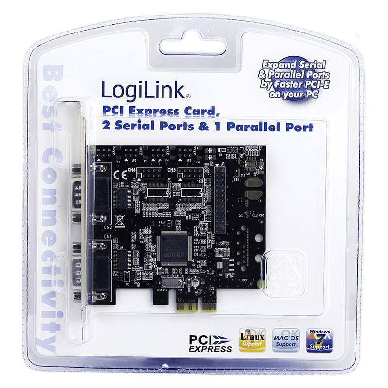 A Logilink PCI Express-kártya a PC-jét két külső soros és egy külső párhuzamos csatlakozóval bővíti. A kártyához szkennert, nyomtatót, egeret stb. csatlakoztathat.