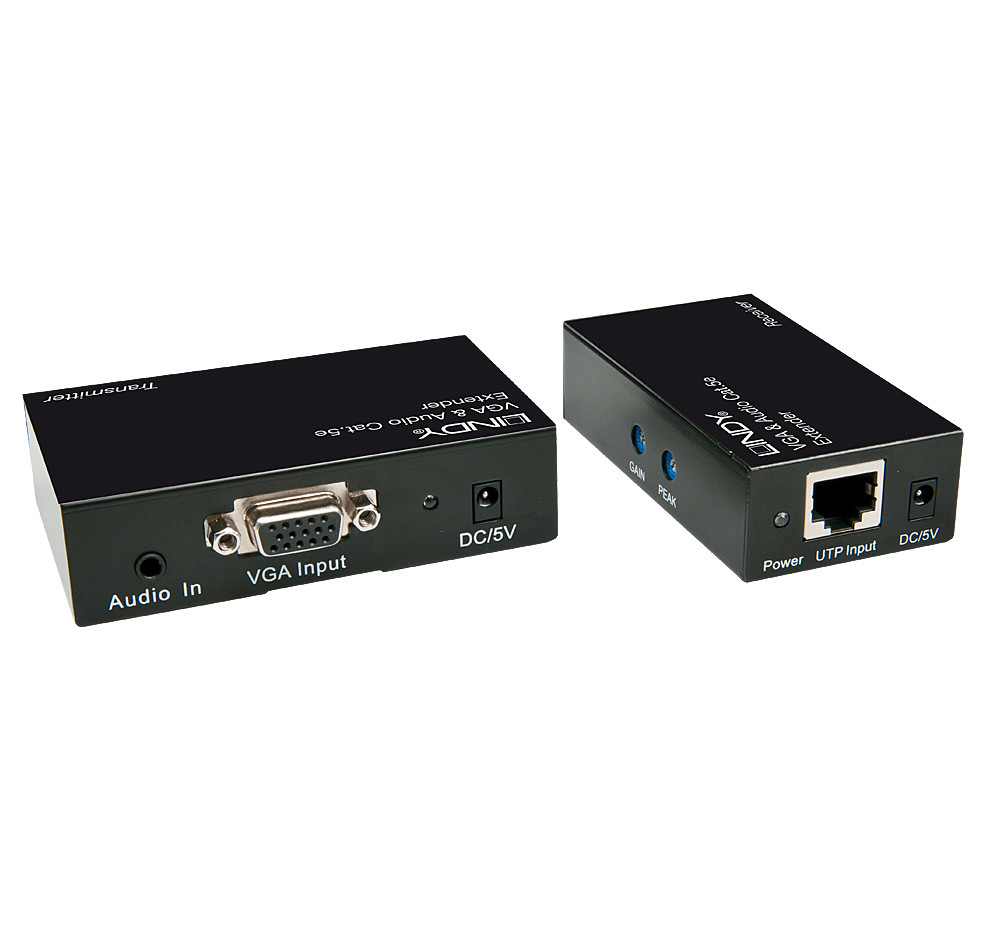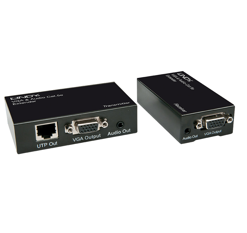 A VGA Extender VGA és audio jelet továbbít CAT5e hálózati kábelen keresztül akár 300m-en át. A távolság nagyban a kábel minőségének a függvénye.