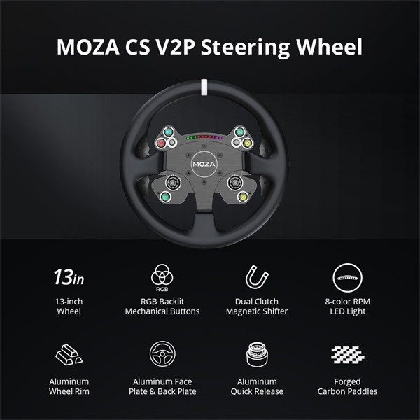 Engedje szabadjára a fantáziáját a CS V2P segítségével, és emelje versenyzési élményét a következő szintre. Garantált tartósság és elegáns megjelenés a repülési minőségű alumíniumötvözet váznak köszönhetően. Testreszabott gyorskioldó az egyszerű telepítéshez és eltávolításhoz. Szénszálas váltólapátokkal a pontos és érzékeny sebességváltás érdekében. Az RGB szekvenciális váltófény jelzőfény dinamikus megjelenést kölcsönöz a versenyzésnek. Programozható mechanikus gombok a kezelőszervek igényeinek megfelelő testreszabásához.