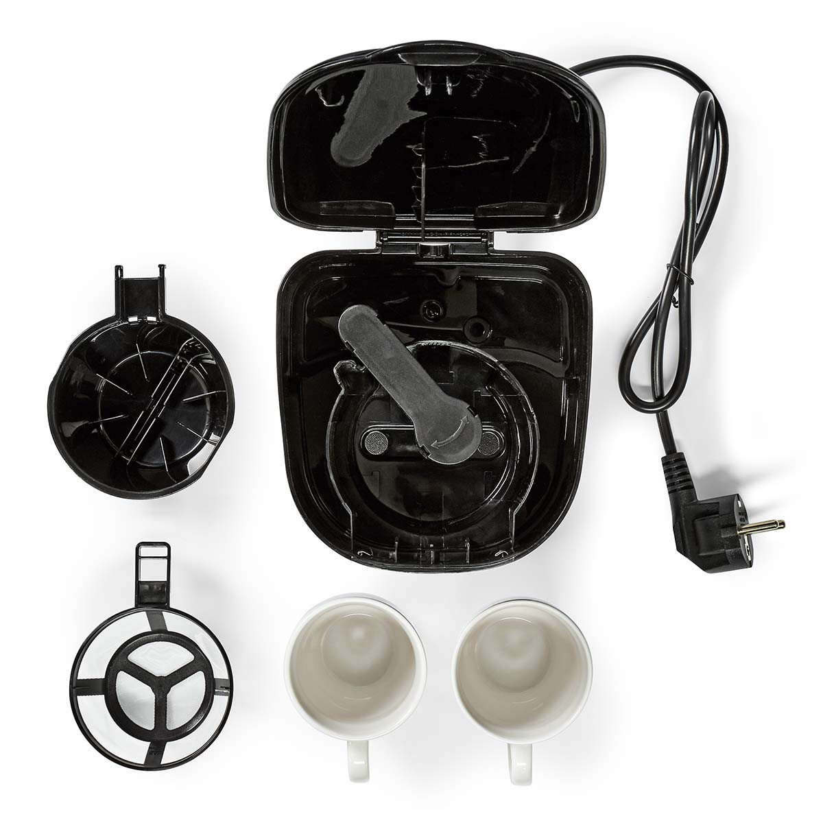 A kávéfőző kapacitása 0,25 liter, ami 2 csésze kávéhoz elegendő. Állandó nylonszűrővel rendelkezik, egy jelzőfényű kapcsoló és automatikus kikapcsolás. Két porcelán csészével is ellátva van.