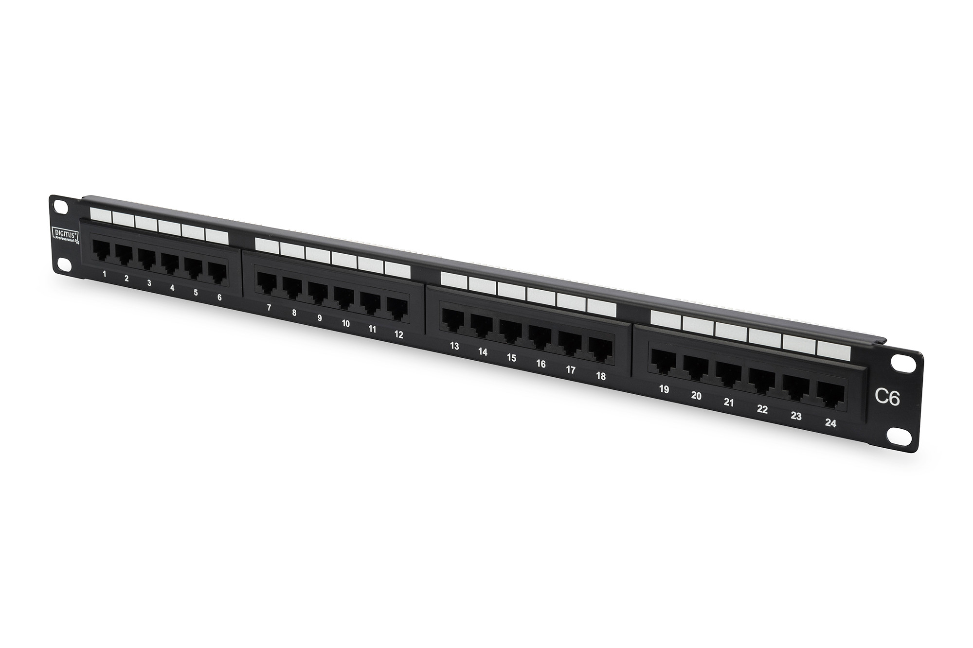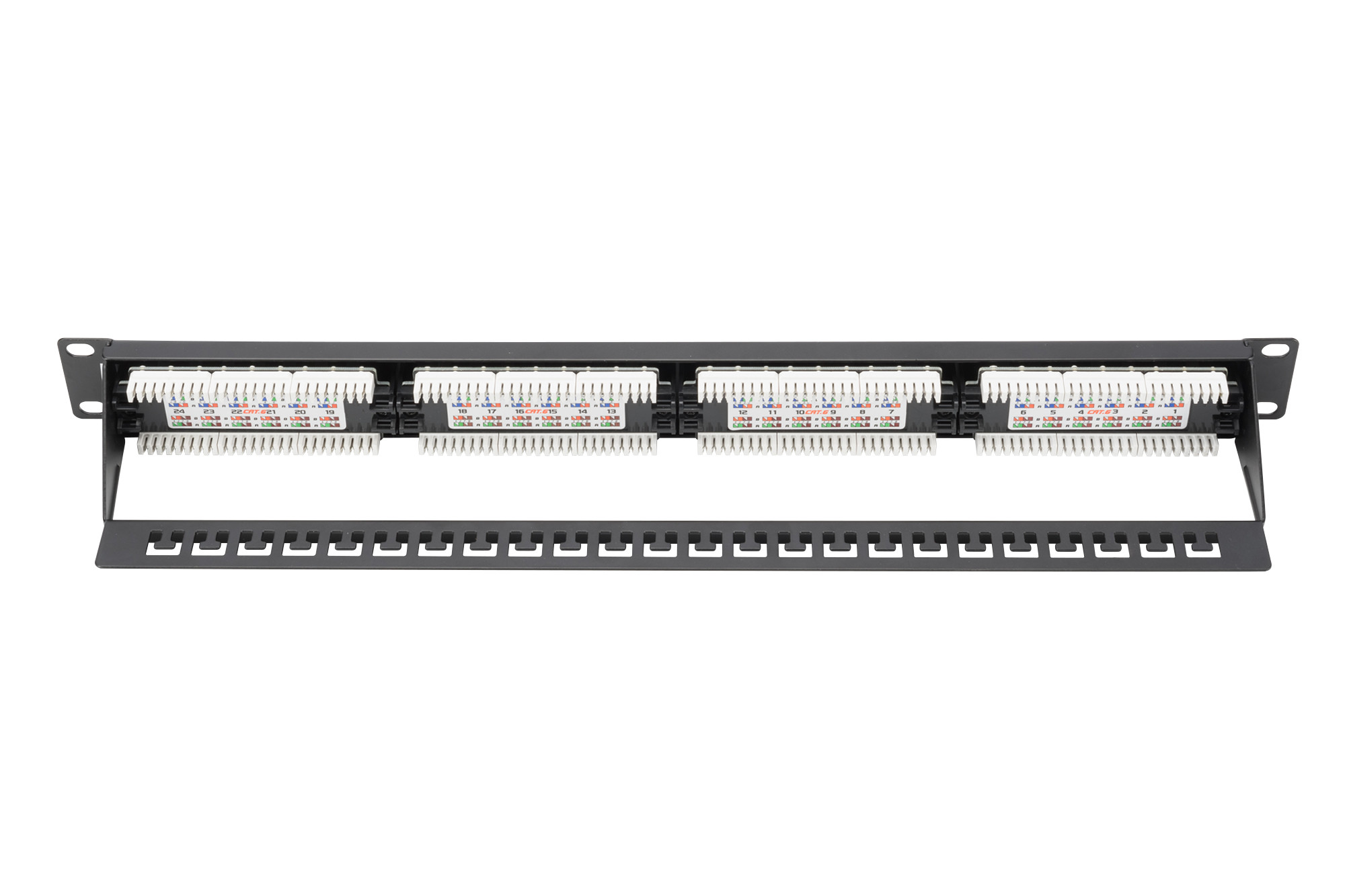 24 portos UTP patchpanel, 19″ széles rackbe szerelhető, 1U magas. A CAT6 vezetékek betűző szerszámmal rögzithetők a csatlakozókhoz. Nem árnyékolt.