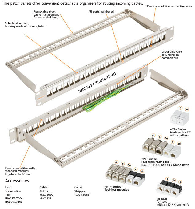 Minden port számozott és címkézési területet tartalmaz. A patchpanel 1,5 mm-es acélból készül, és mind árnyékolt, mind árnyékolatlan aljzatokhoz alkalmas. Az elektromágneses beavatkozásokkal szembeni jobb árnyékolás és a festetlen sínekkel való kommunikáció javítása érdekében a nikkel bevonattal ellátott horganyzott acéllemezből készül.