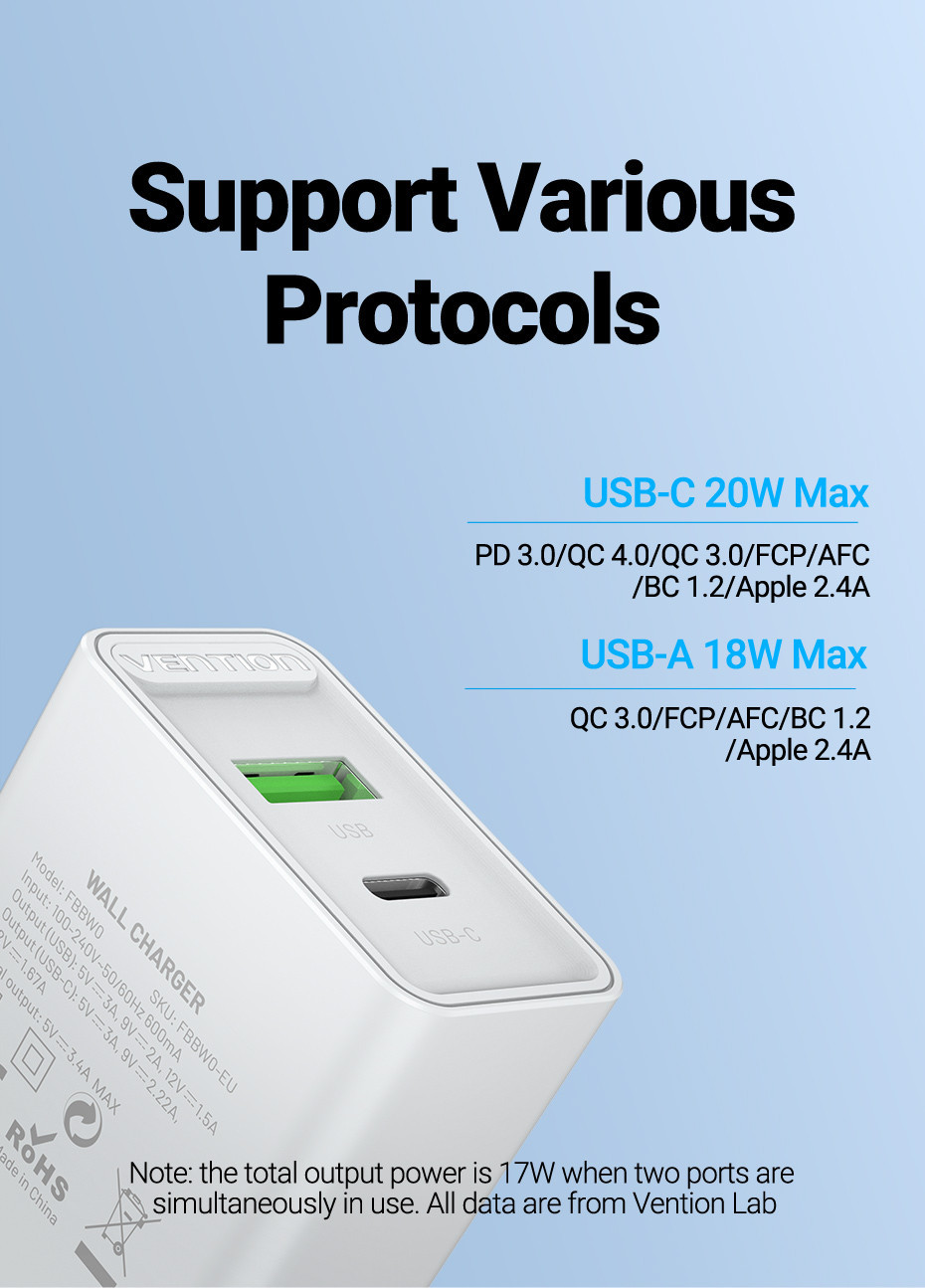 Vention 20W USB-s hálózati gyorstöltő (1x USB-C, 1x USB-A) fehér NEW #1