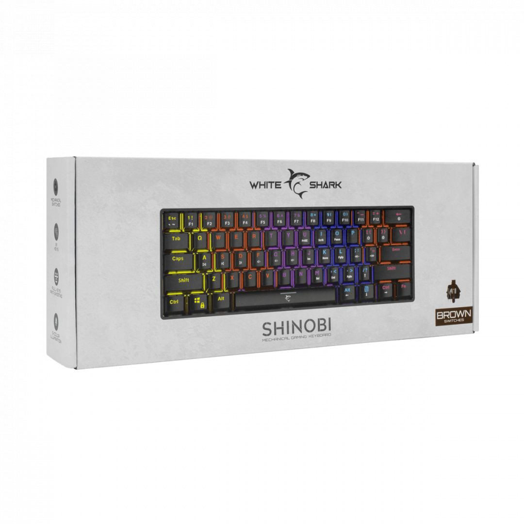 A White Shark célja egy kompromisszumok nélküli kompakt billentyűzet megalkotása volt. A nyíl és navigációs gombokat is sikerült mesterien elhelyezni egy 60%-os billentyűzetkiosztásban. A mindössze 291 mm széles Shinobi jóval kisebb, mint egy TKL billentyűzet. Ennek ellenére minden funkcióval rendelkezik, amellyel egy normál billentyűzet, de sokkal kevesebb helyet kér az asztalodon.